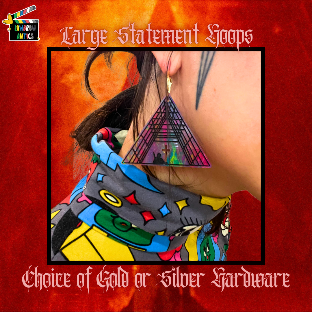 Channel the hypnotic, nightmarish beauty of Mandy with these limited-edition earrings and keychains. Crafted from specialty marbled glitter acrylic, each piece captures the haunting essence of the cult horror classic with its vibrant swirling colors and intricate geometric design.