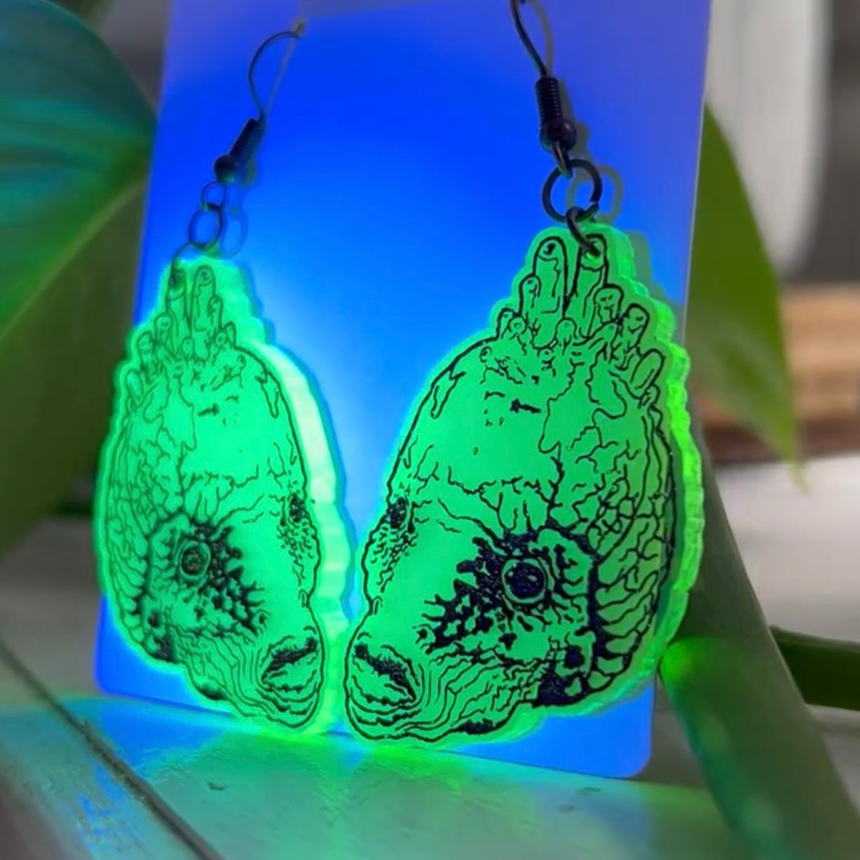 Dive into the bizarre world of David Cronenberg's Naked Lunch with these UV-reactive earrings and keychains. Crafted from high-quality acrylic and featuring hand-painted details, these accessories add a pop of body horror style to any ensemble. The earrings come with fishhook findings for a comfortable fit, while the gold lever-style key rings make them easy to attach to bags or keys. Perfect for fans of surreal cinema, these pieces are a striking conversation starter.