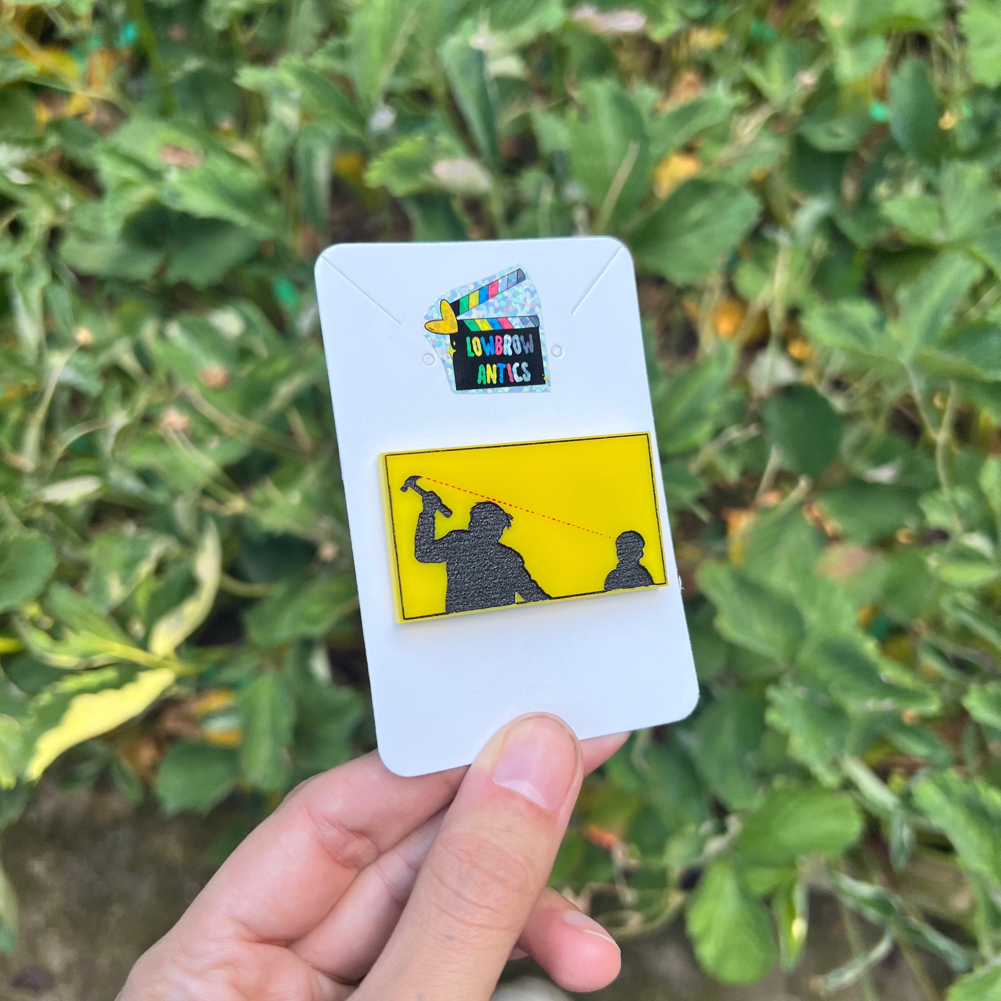 Crafted from durable acrylic with bold, hand-painted silhouette details, this rectangular pin captures the raw intensity and visual style of the film’s legendary corridor brawl. A sharp red sight line evokes the tension of revenge with minimalist flair.