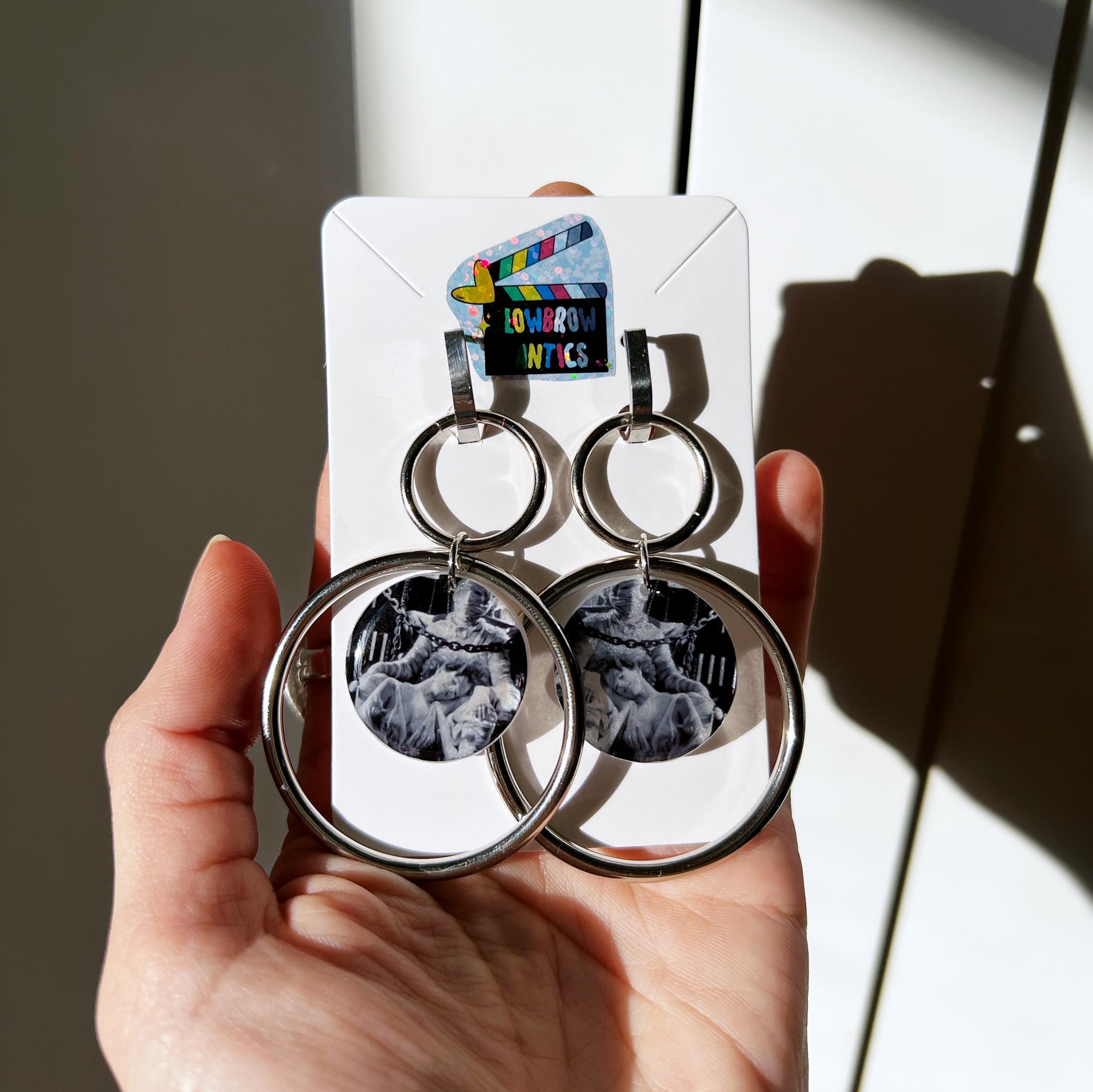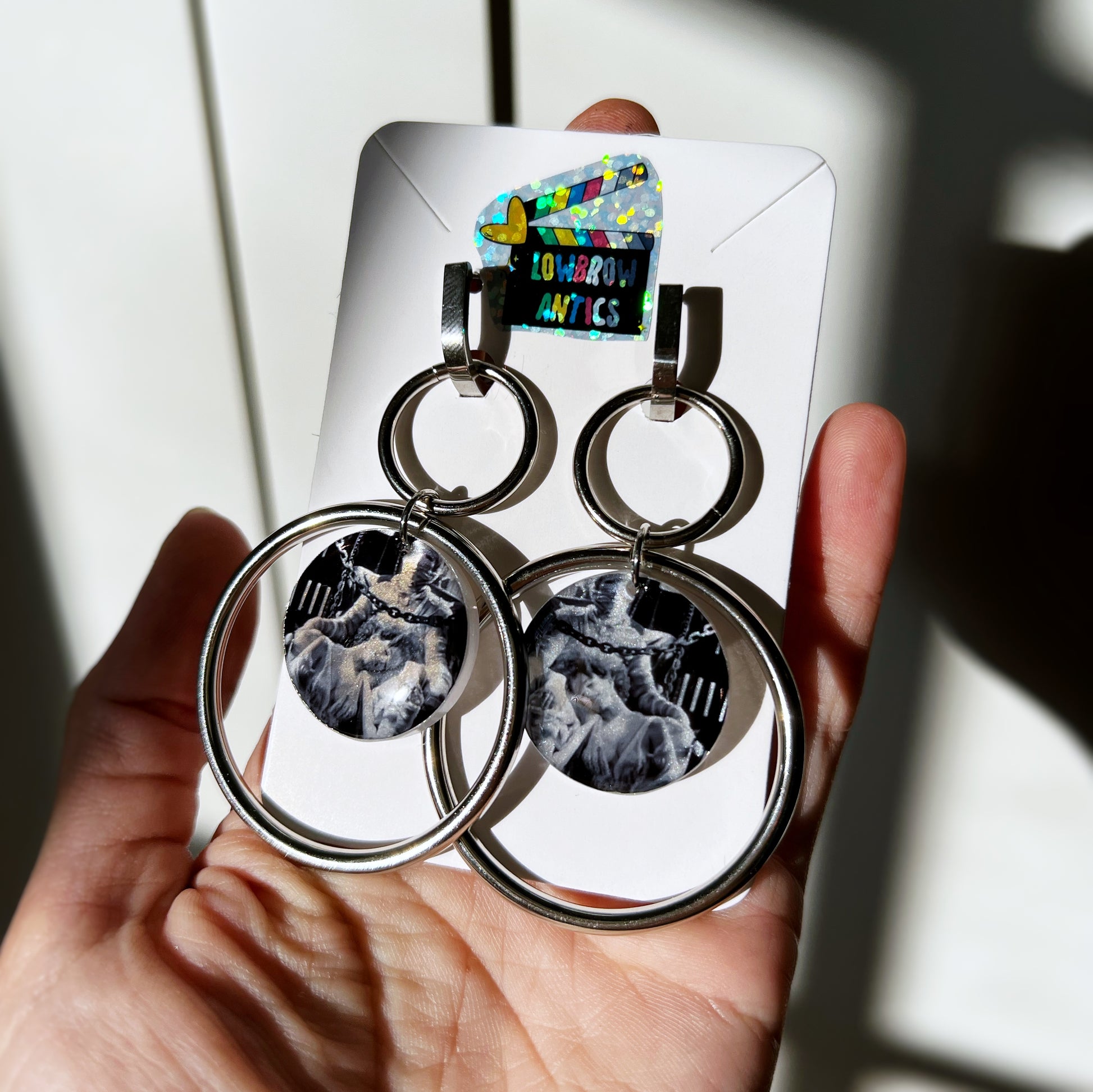 Inspired by the transgressive 1990 cult film Singapore Sling, these handmade acrylic earrings feature film stills from the twisted tale of obsession, sadomasochism, and gothic horror. Encased in large stainless steel hoops, they evoke an industrial, avant-garde aesthetic, perfect for those drawn to cinema’s darker, more unsettling corners.